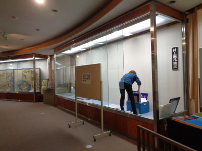 | 2018年10月15日(月) 「誘客推進」業務 閉館後、「展示替え」作業を行いました(^o^)丿 「屏風」を片付け、「鎧・兜」等を展示しました(^<^) |