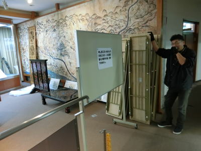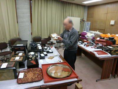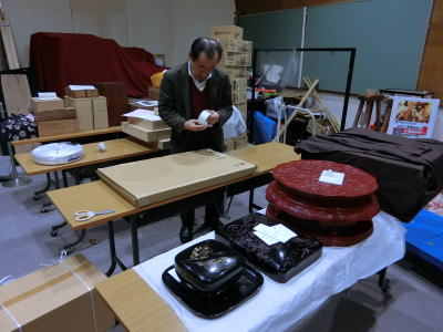 | 2018年12月3日(月) 「誘客推進」業務 「村上堆朱この一品展」から「常設展示」に変更します(^o^)丿 副館長が中心に、作業が進みました(^<^) 「村上堆朱」を一旦下げて、1個づつ梱包していきます(^J^) 業「360.0」→「361.2」SE 酒「579.0」→「579.5」SE 甘「79.0」→「80.3」SE 3.5 |