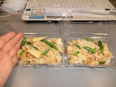 | 2018年5月1日(火) 美女から「タケノコ」ご飯をいただきました(^o^)丿 アスパラガスが彩りをそえてキレイです(^<^) お昼に美味しくいただきました(^◇^) |