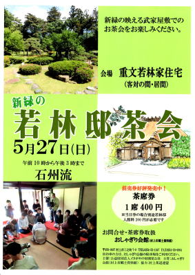 ![]() 茶席「前売り券」:一席「400円(お菓子付き)」(石州流) ※若林家の入館料(200円)を含みます(^◇^) |