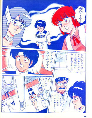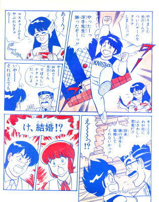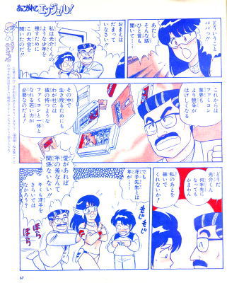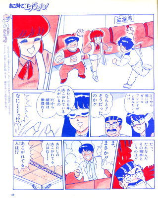 ハローエンジェル <お便り紹介> 冴子先生の好きなカセットはなに?(福岡県・松永龍一クン) ▽冴子先生は好ききらい関係なくゲームしちゃうから 上手なんだよ! <ひと口メモ> 少年キャプテン・コミックスからみなづき先生の 「これもん!アイドル」が出ているのを知ってる? 興味があったら読んでみてね! 最終ページ解説 「げべろっちょ〜っ!!」とコケているのはコサキンネタ・・・ (小堺一機さんと関根勤さんのTBSラジオ番組)。 当時、これが番組内で紹介され、放送作家の 鶴間さんが大ウケしていました・・・・ 柱のコメントが「ご愛読ありがとう・・・・」・・・って まるでコサキンネタやったから終わっちゃったみたいに 見えたらしい・・・(^_^;) 「新しいお仕事がんばって下さいね」と番組内で 励まされたのを覚えております。 |