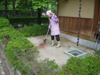 | 2009年5月18日 「嵩岡家・岩間家」では「13日」にご紹介した「藤」の花が前日の強風で沢山散っていました。(>_<) 管理人の村山さんが一生懸命、掃いていました。(^ム^) 花びらが細かく、広範囲に飛んでいましたので、とても大変そうでしたが『自分は気が長いから、こんな仕事は大好きだよ(^o^)』と、心強いお言葉をいただきました。(^◇^) |