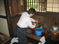 | 2009年7月4日 藤井家管理人の荻野さんが通路(タイル)の「コケ取り」をされていました(^J^) 雨天時に滑って危険なので「灰」を撒いてブラシでコスリ、洗い流します。 以前は「洗剤」や「薬品」を使っていましたが、もったいないので「灰」を代用しています(^J^) ※とても良く落ちます(^◇^) |