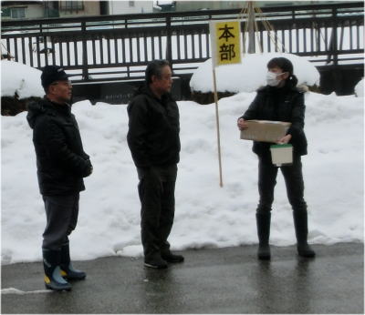 ![]() 資料館から避難してきた片野さんと荻野さん 本部で待機の竹部さん |