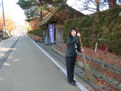 2016年11月8日(火) 「管理運営」業務 美女が朝から「落ち葉」と格闘中です(^o^)丿 車にひかれないように・・・ |