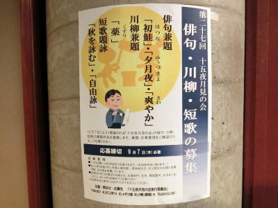 | 2017年7月15日(土) 「誘客推進」業務 第27回「十五夜月見の会」の作品を募集します(^o^)丿 今年のお題 俳句:「初鮭(はつな)」、「夕月夜(ゆうづきよ)」、「爽やか(さわやか)」 川柳:「薬(くすり)」 短歌:「秋を詠む」、「自由詠」開催日:10月7日(土) 会場:「まいづる公園」 事業「132.1」→「132.6」SE 酒「127.2」→「129.2」SE 甘「27.6」→「28.2」SE 3 |