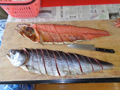 | 2018年12月17日(月) 「収益」事業 「塩引き鮭」の発送が始まりました(^o^)丿 「切り身」加工のご要望の方の鮭を切りました(^◇^) 事「381.5」→「381.8」SE 酒「595.5」SE 甘「87.4」SE 3 |