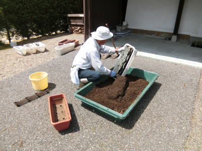 | 2018年5月16日(水) 「管理運営」業務 「佐藤」館長が「プランタ」に花を植えました(^o^)丿 キレイな花を咲かせる為、「土つくり」からされました(^<^) 5月にしては記録的な暑さでした(>_<) |