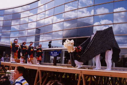 【8月18日】 村上では16日、17日が七夕祭です。 伊勢堂の上に三層のぼんぼりを乗せ、その上に唐傘があり、 竹に短冊や提灯をつけた山車を引き回し、全部で19町内、19台の山車があります。 他町内に親戚があると、ご祝儀をあげて獅子舞 踊ってもらいますが、今年も当家では 「家内安全・商売繁盛・悪魔払い」を祈願して踊ってもらいました。 各町内の青年会が中心になって運営しています。 |