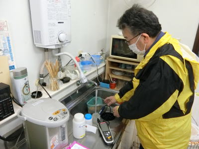 | 2022年12月7日(水) 「管理運営」業務 専門業者が「水質検査」をされました(^o^)丿 「塩素」も出ていました(^J^) 「水」を持ち帰り、詳しく調べるそうです(^<^) 3.5 |