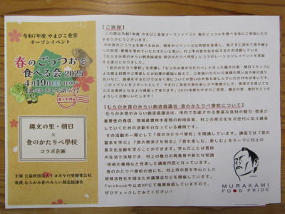 | 2025年4月19日(土) 「指定事業」業務 「春のごっつおを食べる会」を開催しました(^o^)丿 今年は「むらかみ食のみらい創造協議会」の「後援」をうけて、「お食事」をするだけでは無い、新企画になりました(^<^) 食に関するアンケートや、意見交換、情報交換などを参加された皆様と楽しく語らいました(^<^) 私も「塩引き鮭」についてお話をさせて頂きました(^◇^) 3.5 |