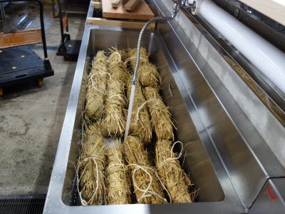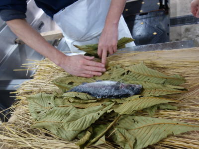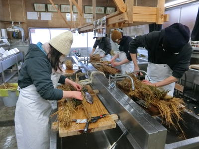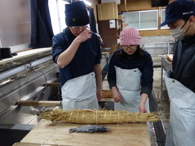 | 2026年1月14日(水) 伝統文化」業務 昔の三面(みおもて)地方で作っていた「ワラマキ(保存食)」を再現しています(^o^)丿 「ニジマス」の内臓を取り除き、塩を擦り込みました(^J^) 「ワラ」を敷き、乾燥させた「トチ葉」で「ニジマス」を包ました(^<^) 冷水に浸して、その後、吊るして干します(^◇^) 3.5 |